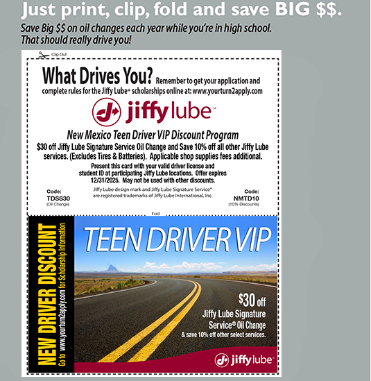 Present this card with your valid driver's license and student ID at participating Jiffy Lube locations. Offer valid throughout high school enrollment. Not valid with other discounts.
