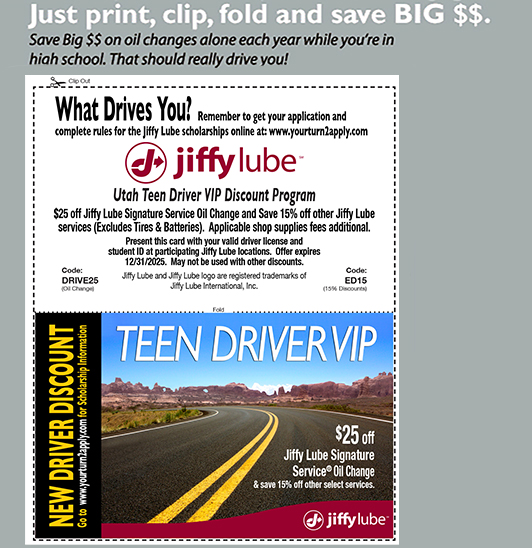 Present this card with your valid driver's license and student ID at participating Jiffy Lube locations. Offer valid throughout high school enrollment. May not be used with other discounts.