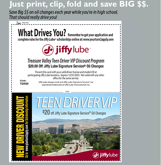Present this card with your valid driver's license and student ID at participating Jiffy Lube locations. Offer valid throughout high school enrollment. Not valid with other discounts.